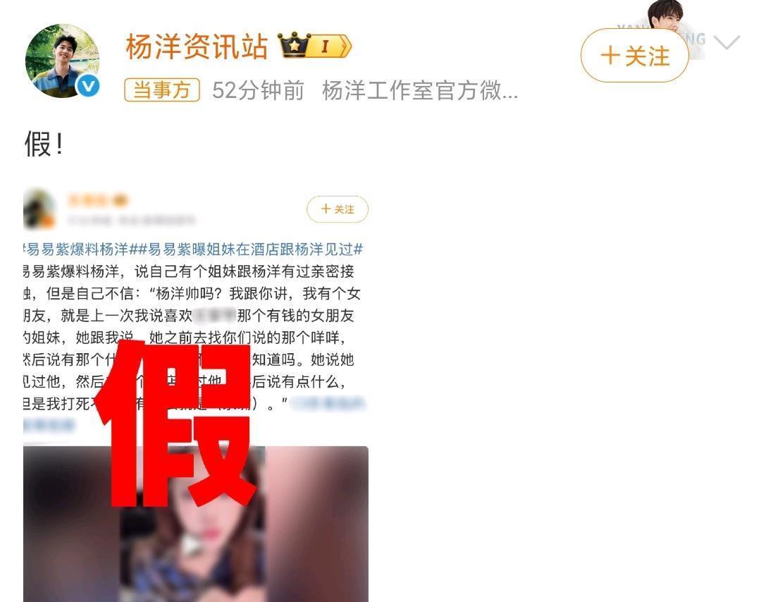2026年1月23日易易紫在直播中突然爆料,称自己有钱闺蜜的姐妹自称和杨洋在酒店有亲嘴这类亲密接触,可她自己又反复说打死都不信,还随口问出杨洋帅吗这样的模糊话,全程没拿任何实证,也没说这个姐妹的身份和接触的具体细节,这番没头没尾的话很快引发热议,杨洋资讯站作为工作室官方账号,当天18:43就直接回了一个字“假!”,平台还标注了当事方立场,不少粉丝都感慨这是杨洋团队近年最快的一次辟谣。